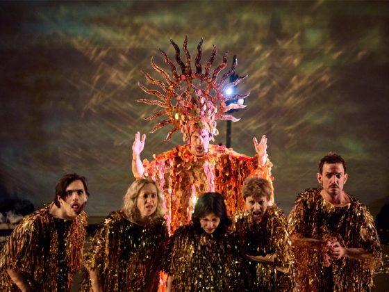 In der überzeugenden Inszenierung von Philipp Preuß mit dem gelungenen Bühnenbild von Sara Aubrecht agiert Sebastien Jacobi in leuchtendem orange- gelb glitzerndem bodenlangem Umhang als weiterer Protagonist bisweilen als ordnende Hand, die aufräumt, was die AkteurInnen zurückgelassen haben, bisweilen als Dekorateur, der etwa ein großes Tuch auflegt oder wegräumt, unter dem sich die Akteurinnen verkriechen, wenn sie sich verbalen Ausfällen der anderen Personen auf der Bühne nicht mehr gewachsen fühlen.