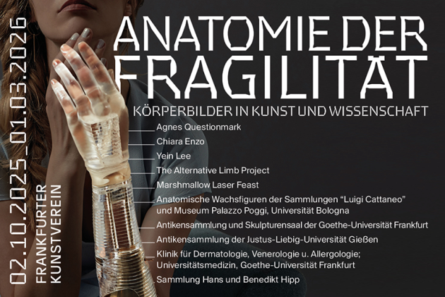Vom 2. Oktober 2025 bis zum 1. März 2026 präsentiert der Frankfurter Kunstverein die Ausstellung Anatomie der Fragilität – Körperbilder in Kunst und Wissenschaft. Die Art und Weise, wie Menschen Körper betrachten, wahrnehmen und darstellen ist im ständigen Wandel. Kunst und Wissenschaft haben seit jeher mit Bildern von Körpern Geschichten über das Menschsein erzählt, und so entstanden im Wandel der Epochen immer wieder neue Körperbilder und Deutungen.