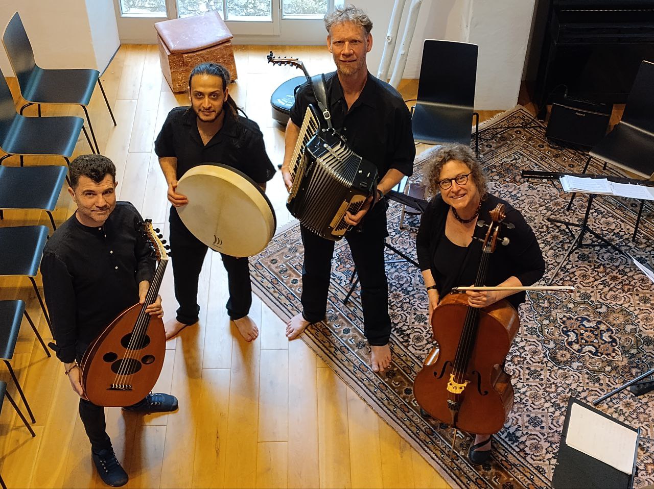 Saif Al- Khayyat (Oud) studierte die alte arabische Musik in Bagdad. Er lebt seit 20 Jahren in Deutschland. Theo Van Der Poel (Akkordeon) und Angela Simons (Violoncello) kommen aus dem klassischen europäischen Bereich. Als Perkussionist bereichert Ahmad Abu Siam dieses abwechslungsreiche Programm. Nach dem erfolgreichen Debut im Frühling letzten Jahres sind die 4 Musiker mit vielen neuen Kompositionen am 17.Januar 2026 um 20.00h im großen Saal der TUFA erneut zu Gast.