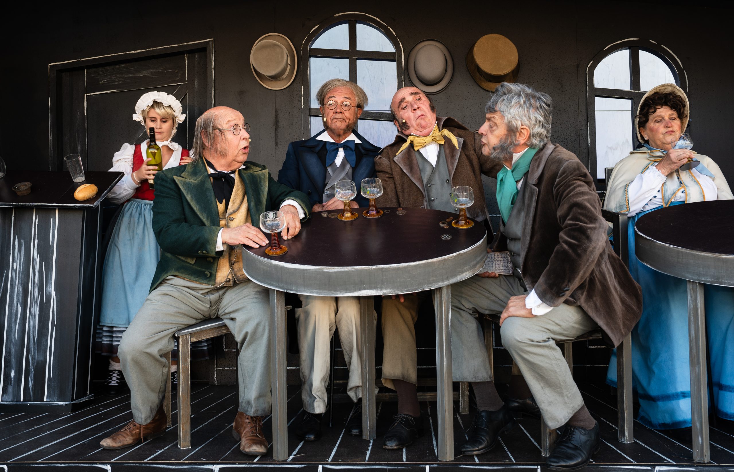 Wer genug trinkt, sieht zweimal so viel von der Welt! Mit diesem Versprechen auf Erkenntnis bestellt Datterich einen Schoppen nach dem anderen. Und wenn das nötige Kleingeld sich dem Ende zuneigt, und dem neigt es sich ständig zu, weiß der Pensionär sich zu helfen: Für einen guten Tropfen schröpft er den Schuhmacher, bezirzt die Wirtin und leiert dem zugezogenen Drehergesellen Schmidt mit lustvoller Penetranz einen gediegenen Rausch aus den Rippen.