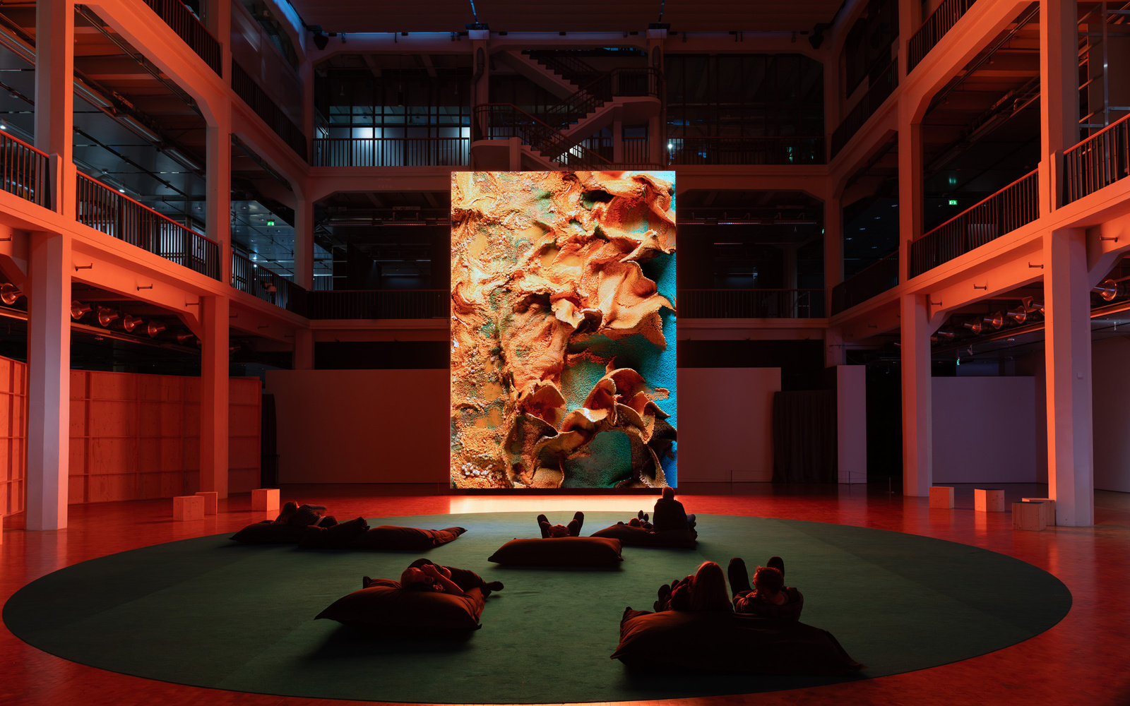 THE SCREEN präsentiert auf einer monumentalen LED-Wand über sechs Wochen hinweg Arbeiten von Refik Anadol, Sasha Stiles sowie den am ZKM beschäftigten Künstlern und Entwicklern Daniel Heiss, Bernd Lintermann und Marc Schütze. Im Zentrum steht ein 8,5 × 6 Meter großer, über zwei Stockwerke reichender Screen, auf dem im Zwei-Wochen-Takt drei künstlerische Positionen zu sehen sind, die sich aus unterschiedlichen Perspektiven mit Künstlicher Intelligenz befassen.