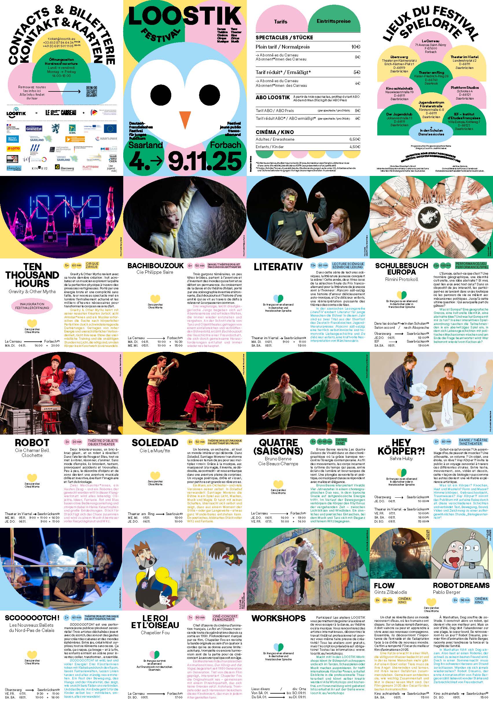 Loostik entame sa 13e édition, plus ambitieuse que jamais ! Un programme varié attend les petit·e·set les grand·e·s dans dix lieux différents en Allemagne et en France. Cette année, trois nouveaux lieuxs’ajoutent à la liste, ainsi que trois nouveaux partenaires : le club de jeunes de la Johannisstraße, le centre de jeunesse de la Försterstraße et l’Institut d’Études Françaises dans la Villa Europa, tous situés à Sarrebruck. De la danse au théâtre d’objets, en passant par la performance, le cirque, le cinéma, la lecture scénique ou encore le ciné-concert, le programme de cette année met à l’honneur toutes les facettes des arts de la scène. Au total, plus de 40 représentations sont prévues. Dix créations soigneusement sélectionnées — dont une coproduction et une production propre — invitent les enfants de 2 à 14 ans à s’émerveiller, à participer et à réfléchir. Le programme est enrichi par une offre complémentaire : trois ateliers intensifs gratuits, deux ateliers scolaires et deux projections cinématographiques permettront aux jeunes spectateur·ice·s de découvrir l’envers du décor et de libérer leur créativité. Avec son programme riche, inclusif et participatif, le festival envoie un signal fort en faveur des échanges culturels et des arts vivants, et affirme que la créativité ne connaît pas de frontières!