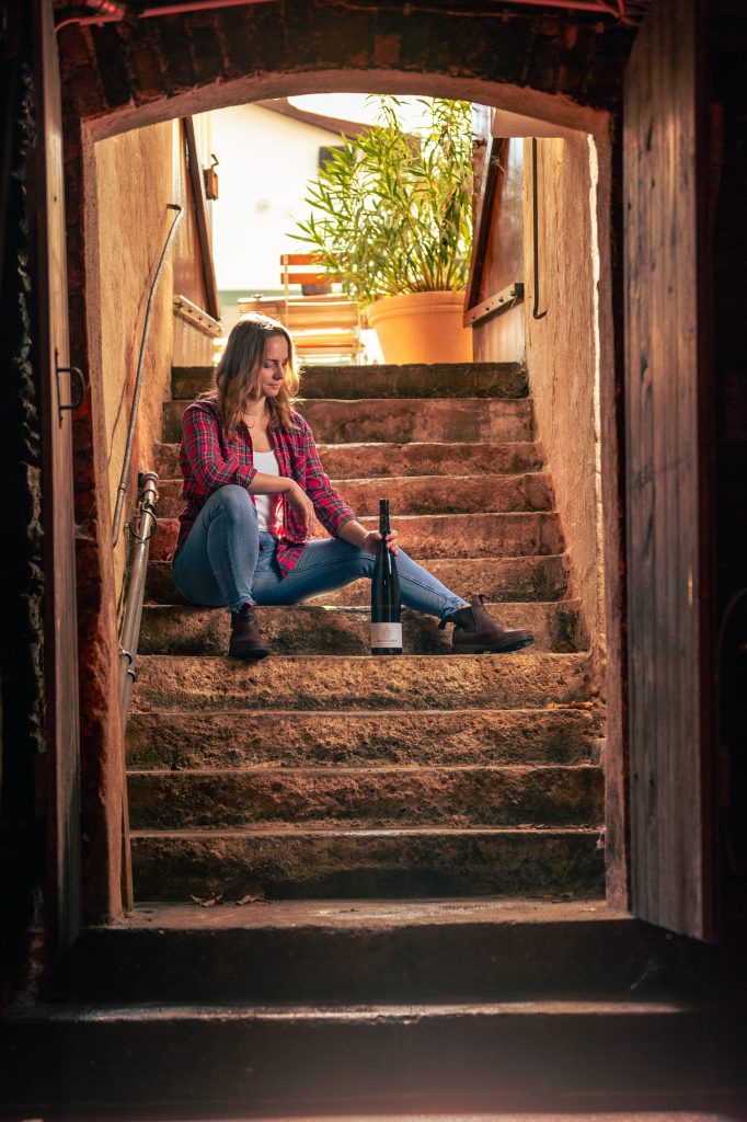 Lena Endesfelder mit einer Flasche Wein aus eigener Produktion © Chris Marmann