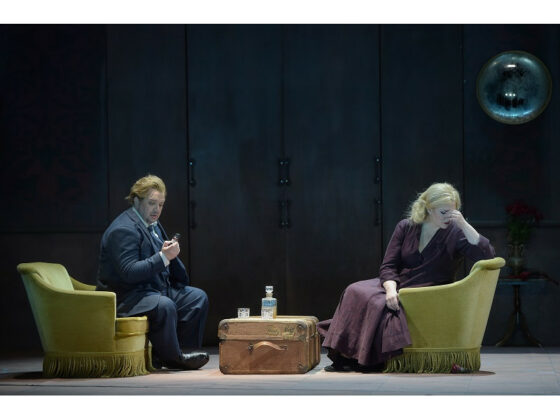 Wir befinden uns in einer spätbürgerlichen Wohnung, die man mit etwas Phantasie als die Wohnung Freuds in der Wiener Berggasse identifizieren könnte, inklusive der Couch,… Nicht zu Unrecht, denn auf Freud beziehen sich die Regisseurinnen ausdrücklich. In ihrer Geschichte von Tristan und Isolde spielt sich das Trauma eines Selbstmordes immer wieder aufs Neue ab, von Anfang an, immer wieder mit dem Unvermeidlichen, das die wahre Liebe nur im Tod ihre Erfüllung finden kann. Und ja, neben Freud nennen die Regisseurinnen noch Goethes „Werther“, Emily Brontë, Viriginia Woolf, Daphne du Maurier und Alfred Hitchcock spielen eine Rolle, ebenso wie die Traumwelten des C. G. Jung: ein Cocktail von Selbstmordgeschichten, Thrillern und Psychosen. Sie verorten das Geschehen ins traute Heim, das die Regisseurinnen als Abbild der menschlichen Psyche sehen, als ein Ort auf der „Fahrt ins Unbewusste“. Für solch ein Bühnenbild hätte fast die Opernwelt eines Richard Strauss und Momente seiner Sinfonia domestica gepasst. Hier wird aber Hitchcock-like die ungeheuer große, berührende und tragische Liebesgeschichte von „Tristan und Isolde“ (neu) erzählt.
