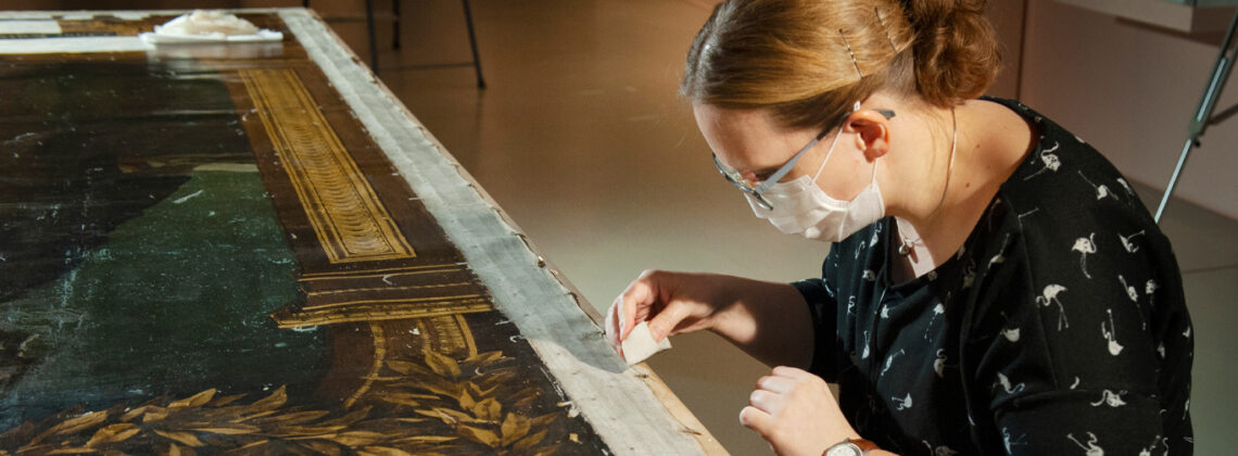 Katharina Deimel befreit die Leinwand von altem Schmutz.