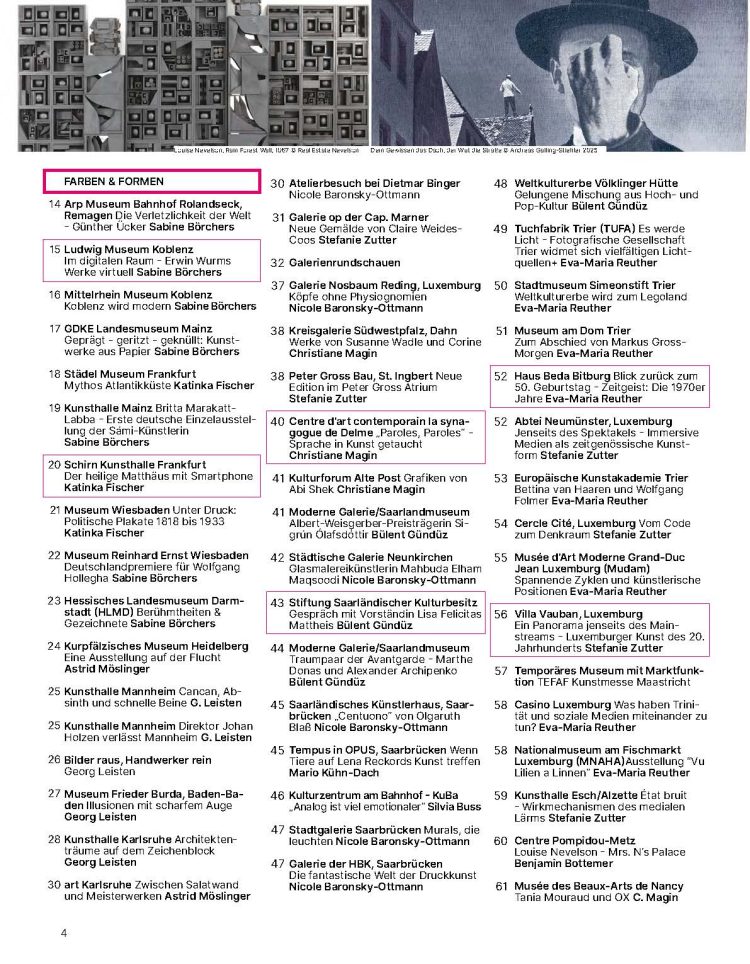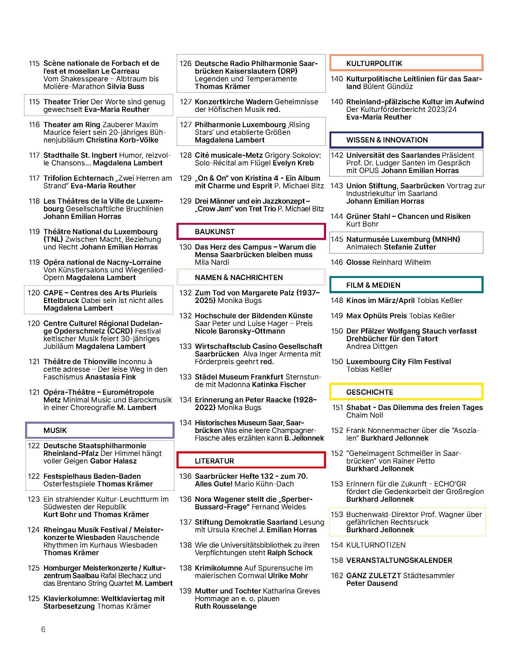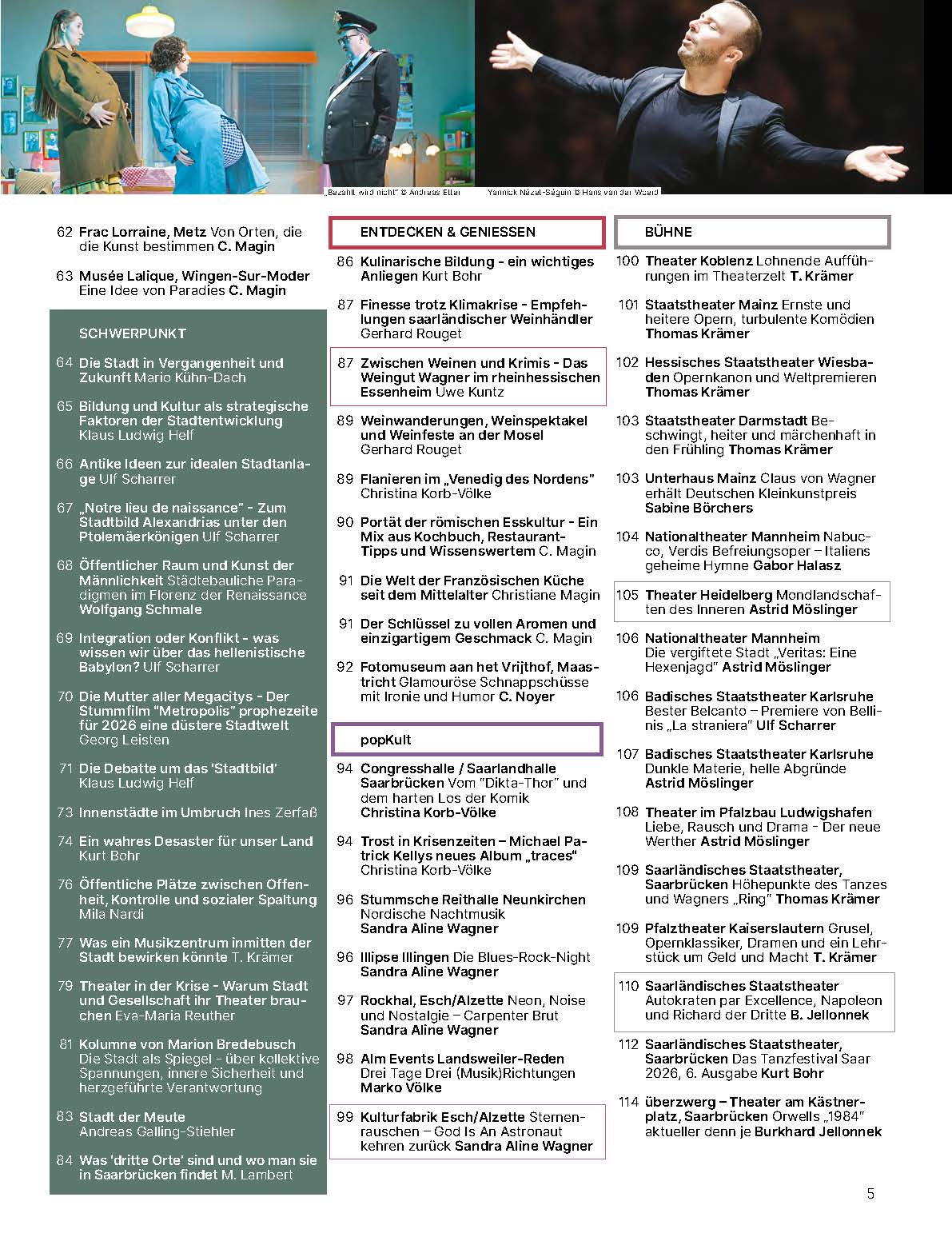 Das OPUS Kulturmagazin enthält aktuelle Kritiken, Veranstaltungshinweise und Beiträge zu den Sparten Bildende Kunst, Theater, Musik, Reisen & Kulinarik, Popkultur, Literatur, Geschichte, Film & Medien, Baukunst, Kulturpolitik, Wissen sowie Namen & Nachrichten. Außerdem behandeln wir in jeder Ausgabe ein wechselndes, brisantes Schwerpunktthema aus unterschiedlichen Expertensichtweisen – immer mit einem intensiven Fokus auf Kultur, aber auch auf andere Fachrichtungen wie Wirtschaft, Gesellschaft, Politik, Medien oder Recht.