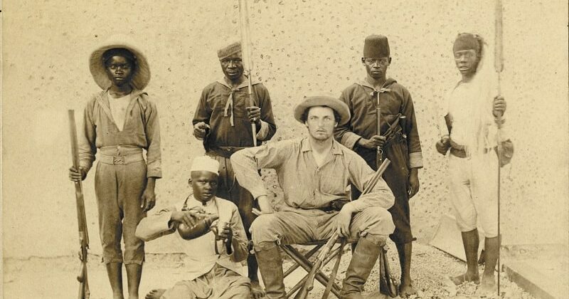Bild: Theodor Bumiller in kolonialer Pose mit ungenannten Soldaten und Teilnehmern einer Militärexpedition in Deutsch-Ostafrika, zw. 1889-1893 © rem
