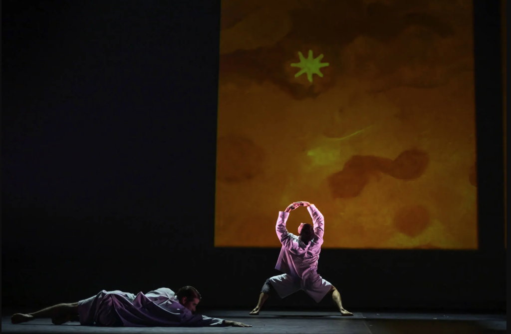 Celis’ eigenes Werk „Alte Erde“ setzt dagegen auf Reduktion. Drei Tänzer (Marco Marangio, Flavio Quisisana, Shawn Throop) bewegen sich zu Oumou Sangarés Saa Magni in weiten weißen Kostümen, eng umschlungen, als wollten sie sich aus einem Traum schälen. Ein ockerfarbener Stoff wandelt sich von Kleid, Schal, und Seil zu Burka und Schutzmantel. Im Hintergrund gleitet Till Neus Gemälde Altes Weltbild über die Videoleinwand – ein visuelles Echo auf mythische Ursprünge. Doch Celis’ Meditation über Pathos und Vergänglichkeit verliert sich im ästhetischen Wohlklang; die Emotion bleibt verhalten, die Bilder schön, aber flüchtig.