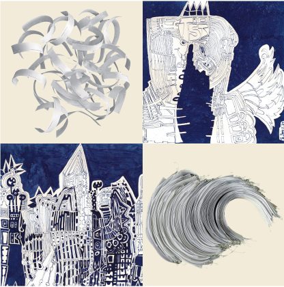 Steinerts Installation wurde von Thomas Brix‘ großformatigen, blauweißen Zeichnungen der Reihe „Out Of The Blue“ inspiriert. Viele der weißen Skizzen auf blauem Grund sind tatsächlich „aus dem Blau“ entstanden, also aus heiterem Himmel, unerwartet. Das Bild entsteht nicht aus einem Konzept heraus, sondern entwickelt sich aus einem Fluss oder einem Impuls. Anschließend führt der Künstler jedes einzelne Motiv weiter und bringt es zu einem für ihn passenden Abschluss. Hochaufgelöst digitalisiert und ins Format 200 x 200 cm übertragen wird die Wirkung der Zeichnungen eindrucksvoll verstärkt.