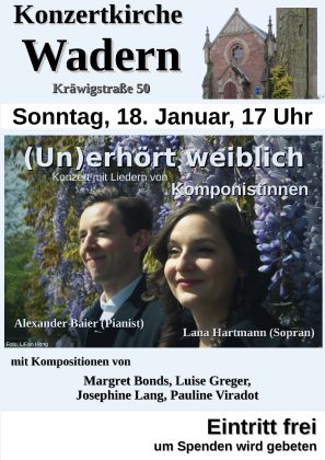 Opernsängerin Lana Hartmann und Klaviervirtuose Alexander Baier präsentieren am Sonntag, 18. Januar, 17 Uhr in der evangelischen Kirche in Wadern den zweiten Teil Ihres Liedprogramms (Un)erhört weiblich, dass Liedkompositionen von bedeutenden Komponistinnen in den Fokus rückt. Weitestgehend unbemerkt und in den Hintergrund verwiesen zieht sich durch die komplette Musikgeschichte auch das Wirken von bedeutenden Komponistinnen, deren Werke allerdings oftmals in den Hintergrund gedrängt wurden und auch heute immer noch wesentlich seltener beachtet werden als die Kompositionen berühmter Männer. Lana Hartmann und Alexander Baier setzen sich für die Schöpfungen dieser Komponistinnen mit ihrem Liedprogramm „(Un)erhöhrt weiblich“ ein. Im vergangenen Mai haben sie bereits im ersten Teil Ihres Projektes in der evangelischen Kirche Wadern Lieder von Fanny Hensel, Emilie Mayer, Nadia Boulanger und Florence Price vorgestellt. Am Sonntag, 18. Januar werden Lana Hartmann und Alexander Baier nun Lieder der Komponistinnen Margret Bonds, Luise Greger, Josephine Lang und Pauline Viradot vorstellen. Margret Bonds war eine Schülerin von Florence Price, Luise Greger und Pauline Viradot waren komponierende Sängerinnen und Josephine Lang und Paulilne Viradot waren auch Zeitgenossinnen von Fanny Hensel und Emilie Mayer, als Komponistinnen der Epoche der Romantik. So bietet das Konzert von Lana Hartmann und Alexander Baier am 18. Januar, 17 Uhr in der evangelischen Kirche Wadern als erstes Konzert der zweiten Auflage der „Konzertkirche Wadern“ im kommenden Jahr die Gelegenheit seltene, beinahe vergessene musikalische Perlen der Musikgeschichte kennenzulernen. Der Eintritt ist frei um Spenden wird gebeten.